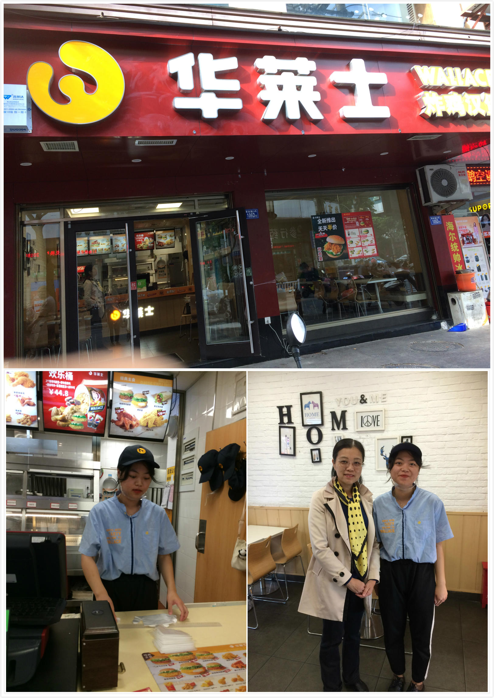 11月23日,17顶岗实习4班班主任陈秀金走访正在华莱士工作的缪雨金.她正给顾客打包、结帐,忙得不可开交。同事反映说缪雨金工作态度不错。和同事相处得很好.事后联系了店长,店长说刚到店时偶有迟到但经教育现在已有长进。