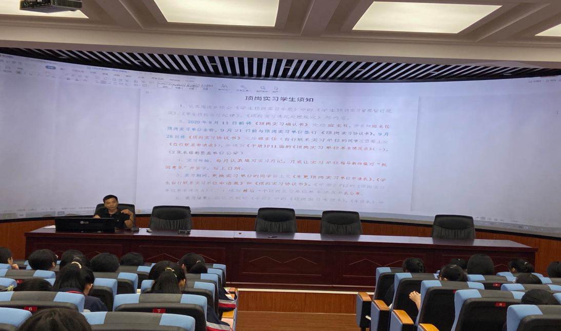 陈泽华副主任和郑林靓老师介绍了学生顶岗实习的整个过程,详细讲解顶岗实习及材料填写的注意事项及要求,包括《学生顶岗实习确认书》、《学生自行联系实习单位申请表》、《学生顶岗实习协议书》、《学生顶岗实习手册》等,帮助同学们熟悉流程、并现场为学生解答疑惑,确保实习材料规范填写并及时上交。