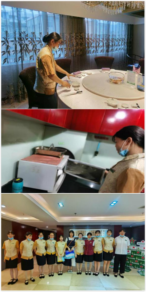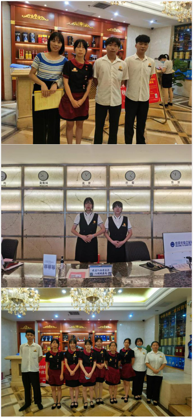 9月26日下午18级旅游班班主任阮莎莉老师前往学福安富春大酒店巡查学生顶岗实习情况。有17位同学安排在富春酒店实习,其中客房5人(兰水忠、李英、黄静芸、钟雨星、谢晓云),餐厅12人(蔡夏梅、张丽玲、刘月燕、雷丽娇、王兴培、郑锦霞、罗岁娇、陈燕格、陈泓园、连艳、林彩凤、陈婷婷),学生们目前均在职在岗,且经过几天的培训和熟悉流程,都表示已经开始适应实习岗位的工作节奏,借着巡查的机会,阮老师和同学们再次强调实习期间一定要端正态度,本着去学习的心态,认真刻苦的做好实习期间的各项工作。