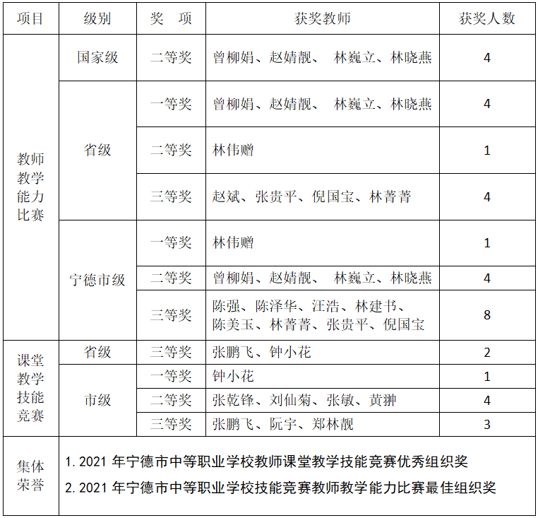 附:2021年福安职业技术学校教师参加各级教学能力比赛获奖情况