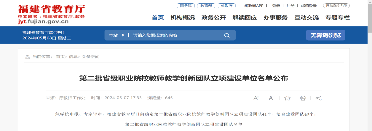 福建省教育厅日前确定第二批省级职业院校教师教学创新团队立项建设团队41个、培育建设团队40个。经学校申报、专家评审、网络公示,我校幼儿保育专业群教学团队成功入选第二批省级职业院校教师教学创新团队培育建设团队。这是宁德市中职院校唯一入选的一支教师教学创新团队培育建设团队。