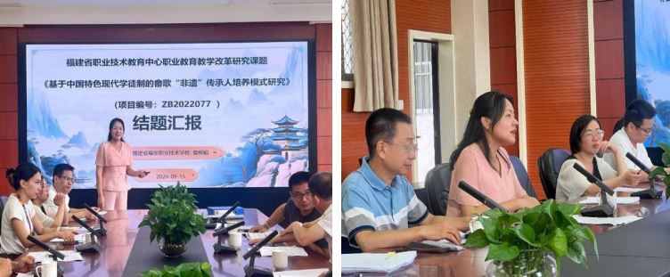 课题主持人曾柳娟校长就《基于中国特色现代学徒制的畲歌“非遗”传承人培养模式研究》课题的研究情况进行了详尽的介绍。从课题的研究背景、实施过程、主要成果及创新点进行阐述,特别强调了该模式在保护与传承畲歌这一非物质文化遗产方面所取得的显著成效,展现了职业教育在文化传承与创新中的独特作用。