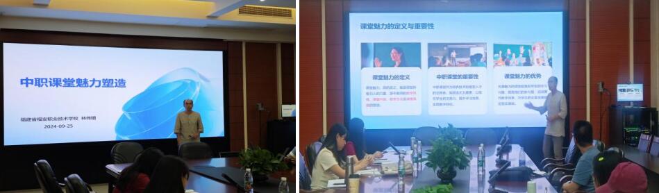 宁德市名师、办公室副主任林伟赠则以《中职课堂魅力塑造》为主题,以自己从校级公开课到宁德市级再到省级公开课以及福建省职业院校教师教学能力比赛的课堂教学设计入手,如何结合专业特点、学生特点以及学生特长调整课堂教学策略,充分调动学生的学习积极性和主动性。