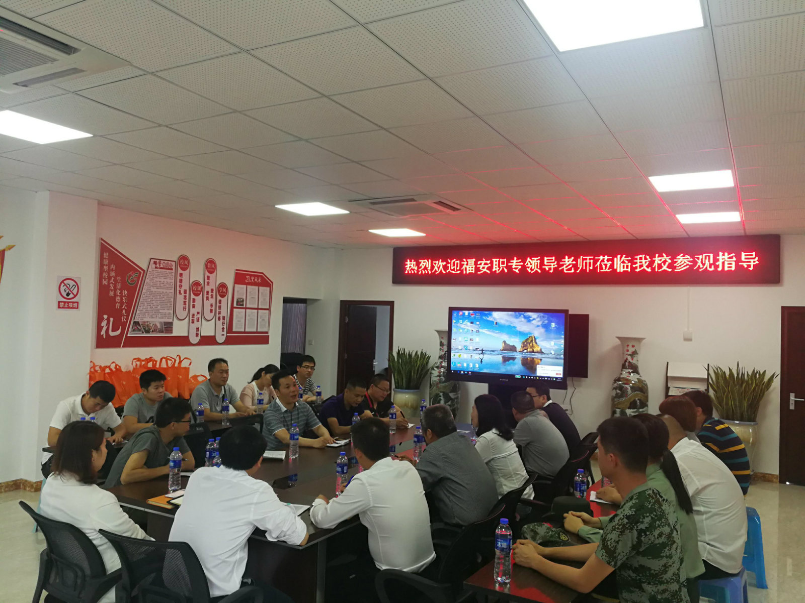 最后,大家在学校会议室,观看了工贸学校宣传片,听取郑建芳副校长“八礼四仪”德育专题讲座,以及学校德育建设、校园文化建设的特色等经验传授。“八礼四仪”系列宣传教育活动,对于规范中职生行为规范,提高学生审美情趣,增强学生礼仪意识,有很大的推动作用。座谈会后,双方学校的生管、保卫、安全等部门负责人进行对接,互动交流。