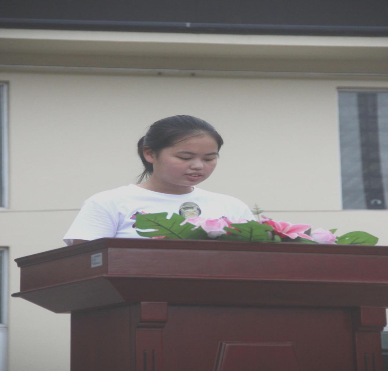 再次,由新生代表吴姝婷发言,他代表所有参训的同学表示:在接下来的几天,一定会听从教官的指挥和安排,不辱使命,圆满完成军训任务;一定会用坚毅、刻苦、诚实、勇敢等,书写好跨进福安职业技术学校的第一步!