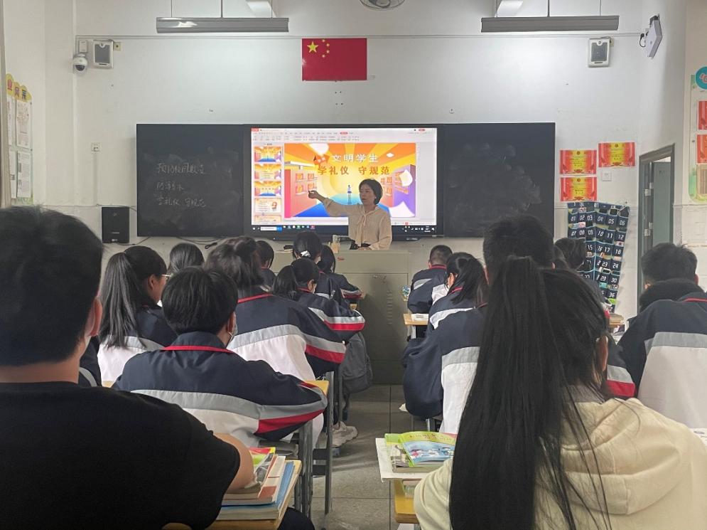 在定期举行的年段例会上,22级两位年段长也对近期的文明礼仪活动开展宣讲,希望同学们经过本次学习礼仪活动,今后能从仪容仪表、行为举止等方面约束自身,争做文明礼仪好榜样。学校也会通过校园督导队的方式,在校园提醒检查,创设"人人讲文明,班班重礼仪”的校园氛围。