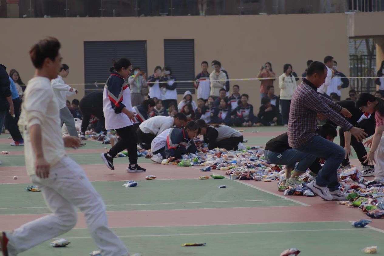 本次运动会新增趣味零食争夺赛,受到了全体师生的追捧。枪声一响,气氛高涨。同学们欢呼雀跃,为奔跑的班主任、科任老师和同学加油呐喊。在阵阵欢呼声中,各个班级满载而归,大家脸上都洋溢着幸福的微笑。