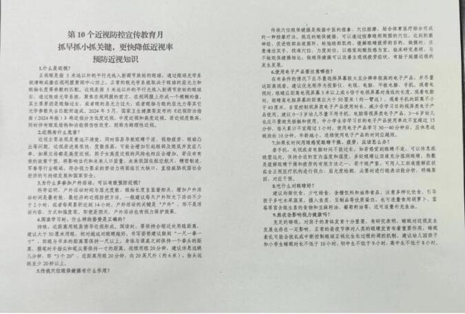 为贯彻落实习近平总书记关于儿童青少年近视防控工作系列重要指示批示精神,进一步加强学校健康教育,推动学校全面落实《综合防控儿童青少年近视实施方案》《儿童青少年近视防控光明行动工作方案(2021—2025年)》。我校开展了近视防控宣传教育月主题活动。活动主题是“抓早抓小抓关键,更快降低近视率”。