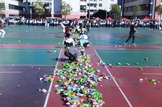 运动会的最后一个项目“零食大作战”为这场运动会增添了别样的欢乐与趣味。每个班级派出师生代表队,班主任与科任老师交替前往零食区抢运食品,本班20名学生席地而坐,以接力的方式把零食运至终点零食箱。平日站在讲台上的老师们换上运动装,一改严肃形象,与学生们共同完成挑战,默契配合展现别样风采,欢声笑语响彻操场。