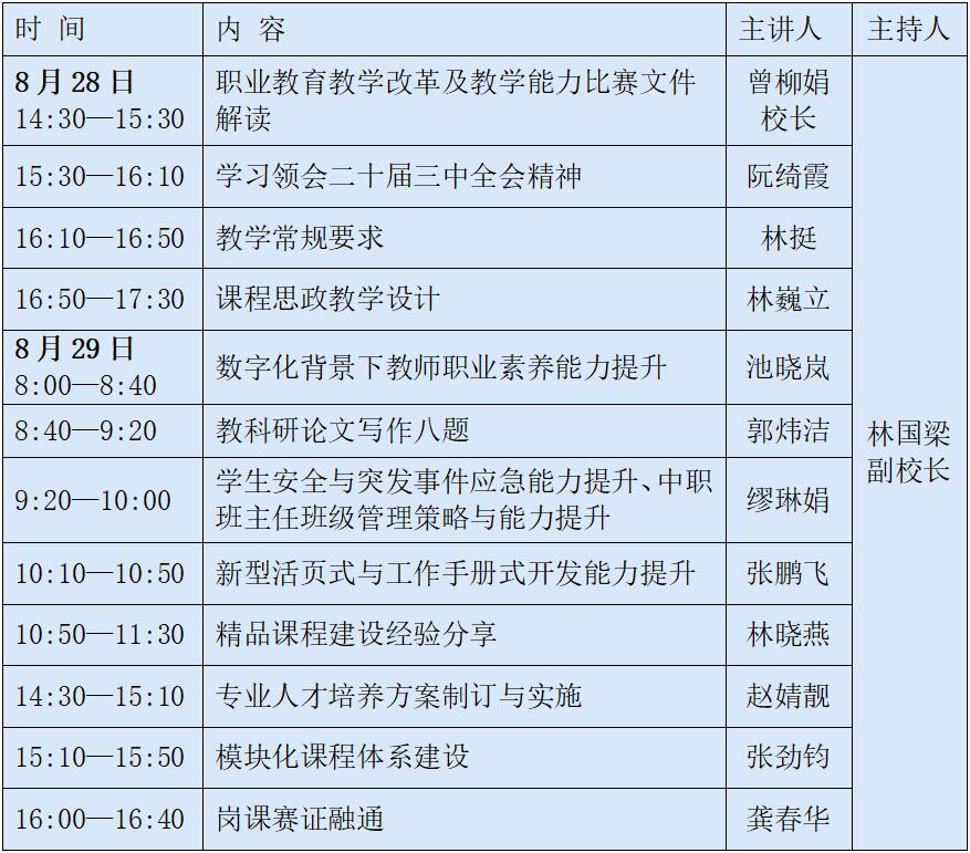 为深入学习党的二十届三中全会精神、贯彻全国职业教育大会精神,增强教师的使命感和责任感,深化教育教学改革,创新教学方式方法,提升师德素养,引导教师灵活运用教学方法和手段,提高教育教学能力,树立正确的课堂观、学生观、教师观和评价观。我校于2024年8月28日-8月29日面向全体任课教师在3D旅游实训室开展了2024-2025学年福安职业技术学校教师全员培训,由福建省学科带头人曾柳娟校长和10位宁德市名师学带培养人进行经验分享。