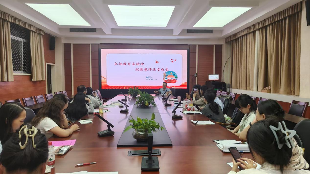 校党总支委员、教研室主任谢石生老师先后做了《校园宗教政策、法律、法规》与《弘扬教育家精神,赋能教师专业成长》主题培训。在宗教政策解读中,谢主任结合《教育法》《宗教事务条例》等法律法规,明确 “教育与宗教相分离”的基本原则,详解 “两个不得”“五个严禁 ”等核心要求,引导新教师提高防范校园宗教渗透的意识与能力,坚守校园育人净土。