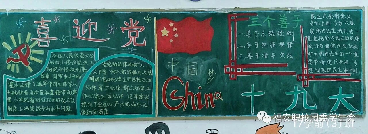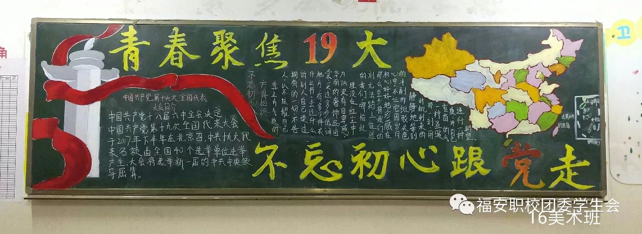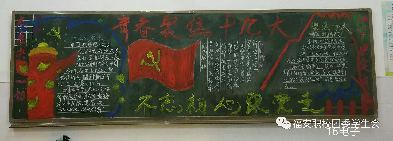 为加强爱国主义教育,美化班级文化环境福安职业技术学校开展了以“青春聚焦十九大,不忘初心跟党走”为主题的班级黑板报评比活动。以下是本次板报评比的前5名评选照片及各班成绩: