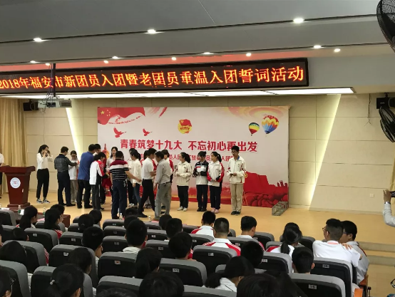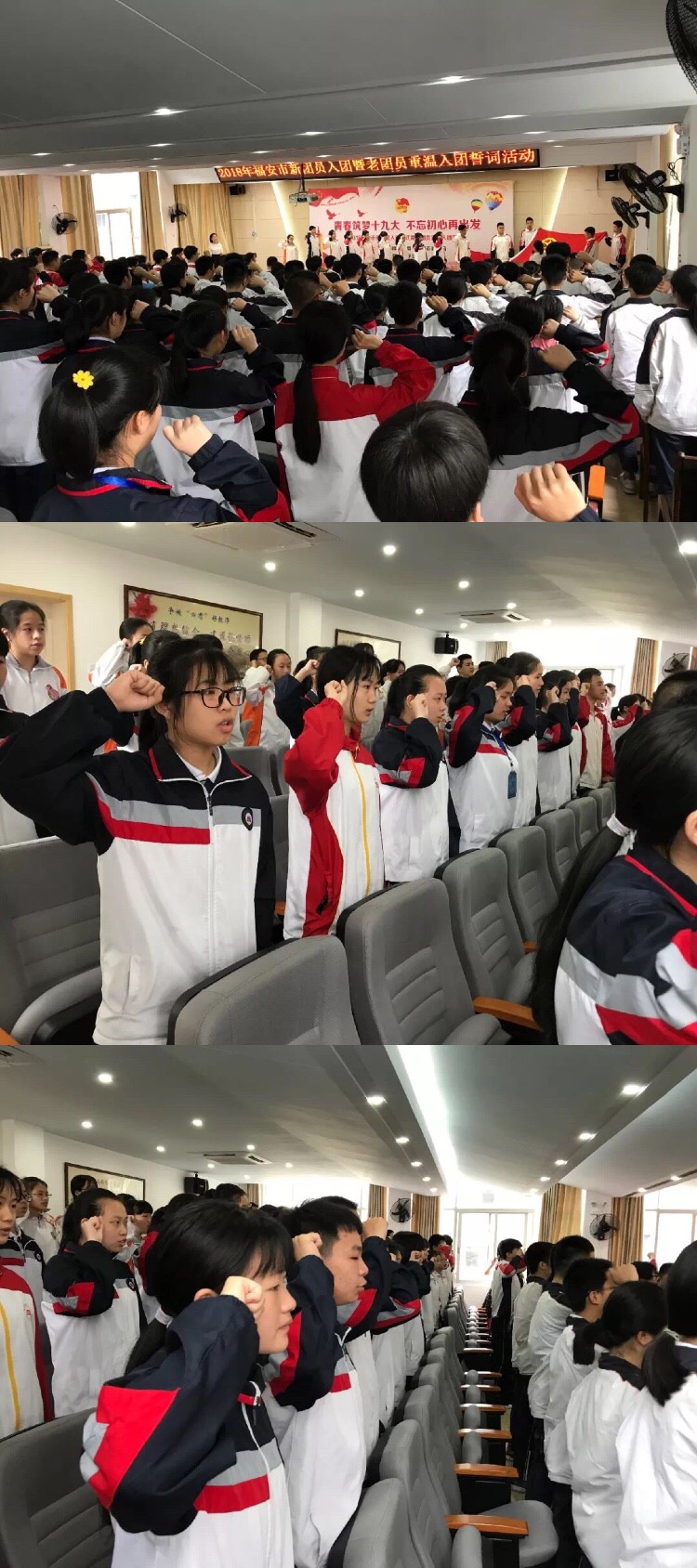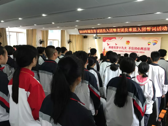5月3日上午,由福安市教育局和团市委主办、宁德市民族中学团委承办的“青春筑梦十九大,不忘初心再出发”2018年全市新团员入团仪式暨老团员重温入团誓词活动在宁德市民族中学阶梯教室会议室隆重举行。我校新团员代表与来自福安城关各中学的新团员代表参加宣誓活动。