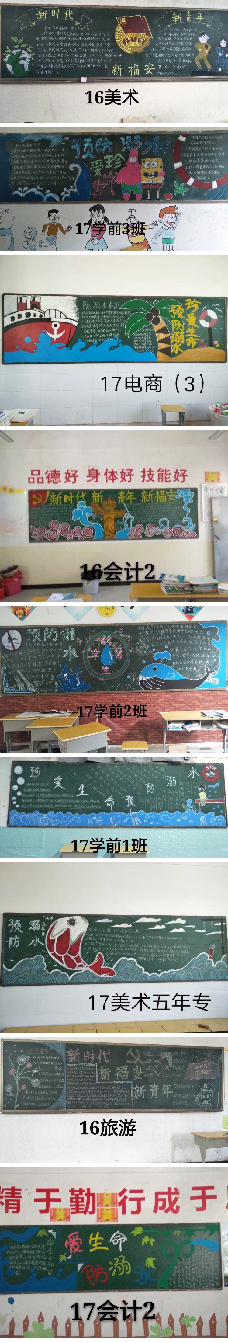 没有哪一代青春是容易的,没有哪代的青年可以简单被定义,我们是新时代的福安青年。青年,人生最绚烂的季节,但随着夏季来临气温逐渐上升进入学生溺水安全事故的高发期。我校为此开展了以“新时代新青年新福安”和“珍爱生命,预防溺水”为主题的班级黑板报评比活动。以下是