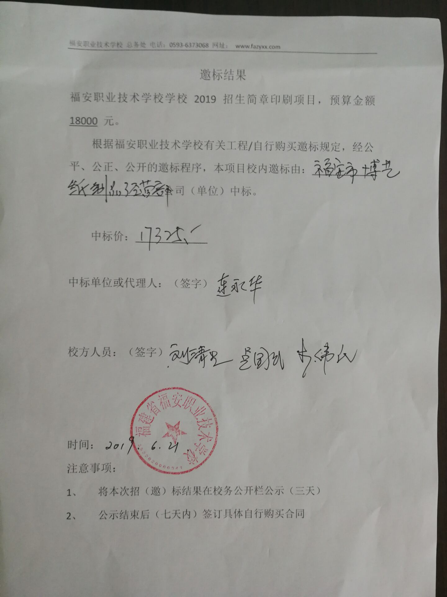 福安职业技术学校2019招生简章印刷项目邀标结果公示