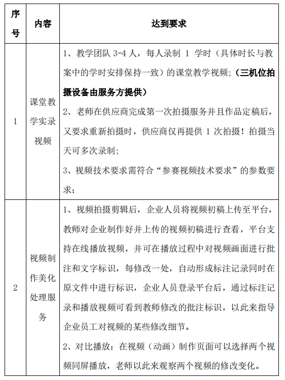 为了校教师参加2024年教师教学能力比赛,现将我校48节参赛课进行拍摄,对课堂教学实录视频记录,现特向社会公告,具有视频拍摄与后期制作的单位参与竞标,本次服务预算经费4.9万元。具体见下表内容: