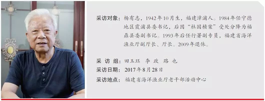 杨有志:习书记对我个人可以说有再造之恩。1984年,我在霞浦县当县委书记。当时闽东地区只有霞浦一个小口岸开展对台贸易,受中央精神的鼓励,在地委要求之下,我们开始把对台贸易扩大,大胆试大胆闯,但没想到一下子“冒”了。当时规定,大陆和台湾做生意单笔不能超过3万元,也就是小额贸易,但是我们做了一笔500万元的蘑菇罐头交易,也就是闻名一时的“杜国桢案”。杜案当时影响很大,处理结果是把我由县委书记降为福鼎县委副书记,并给予党内严重警告。客观地讲,这个案子对闽东干部的改革开放热情打击很大,大家都背上了思想包袱,不敢往下闯了。习书记到宁德以后知道这个情况,对我非常关心,一直鼓励我:“不要紧,你是一条汉子。只要你大胆工作,干出成绩,组织还会关心和重用你。”当时,大多数人对于我们这种犯了错误、受过处分的人都既同情又敬而远之。习书记非但没有如此,反而对我体恤备至,愿意给我这样犯过错误的同志重新投身事业的机会。跟着这样的领导干工作,哪还能没有动力、没有干劲呢?1988年《福建法制报》刊登了一篇我的访谈文章《放胆书记话放胆》,我讲了这个看法。后来我老婆得了白血病,习书记还专门来看望慰问。在当时那样的情势下,习书记的宽容与信任犹如春风化雨,感动和激励着我们再次出发。