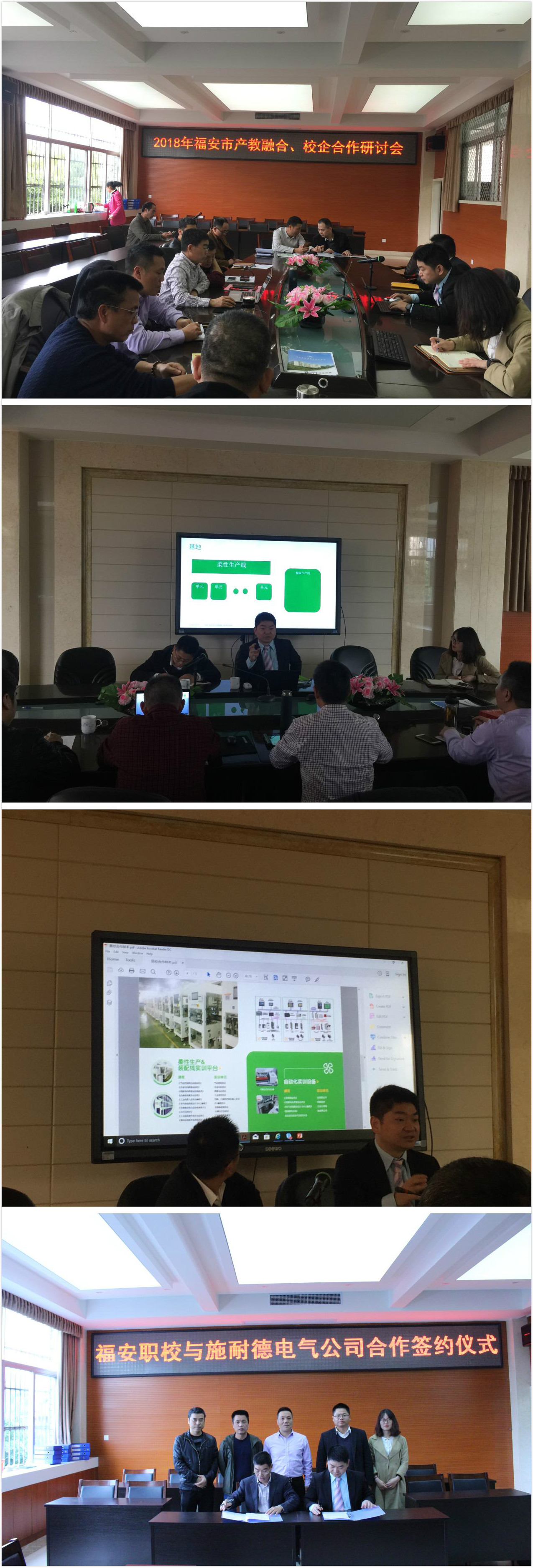 3月14日下午,福安市“产教融合、校企合作”研讨会在福安职业技术学校会议室召开。施耐德电气有限公司经理陈斌、博众精工科技股份有限公司经理宋波、福安市大华发展公司(产投)经理陈光、福安市电商协会会长林中以及福安职业技术学校校领导、教务处、校企合作办负责人参加。会议由李成文校长主持并作了重要讲话。