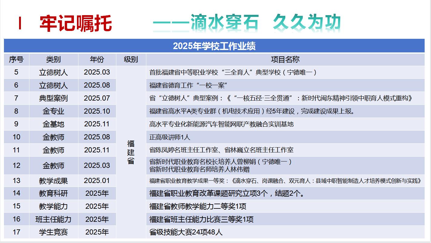 校长曾柳娟代表学校作 2025 年度工作总结讲话,她首先向全体教职工的辛勤付出致以诚挚感谢。她指出,2025 年是学校 “十四五” 规划收官的关键之年,更是向国家级优质中职学校迈进的实干之年。这一年,学校在党建引领下斩获多项荣誉,成为首批福建省中等职业学校 “三全育人” 典型学校,“一核五径・三全贯通” 育人模式入选省级典型案例;教学提质成效显著,机电技术应用高水平专业群完成建设成果上报,新能源汽车智能网联产教融合实训基地顺利建成,22 级高职分类考试 1010 人全部上线、11 人成功考入本科院校;师生竞赛捷报频传,不仅在世界职业院校技能大赛 “机电设备安装与运维” 赛道(中职组)首夺金奖,实现宁德市该领域历史性突破,还累计获得各级奖项 172 个,其中教师奖项 48 个 93 人、学生奖项 112 个 218 人,彰显了学校 “崇德强能” 的办学理念。