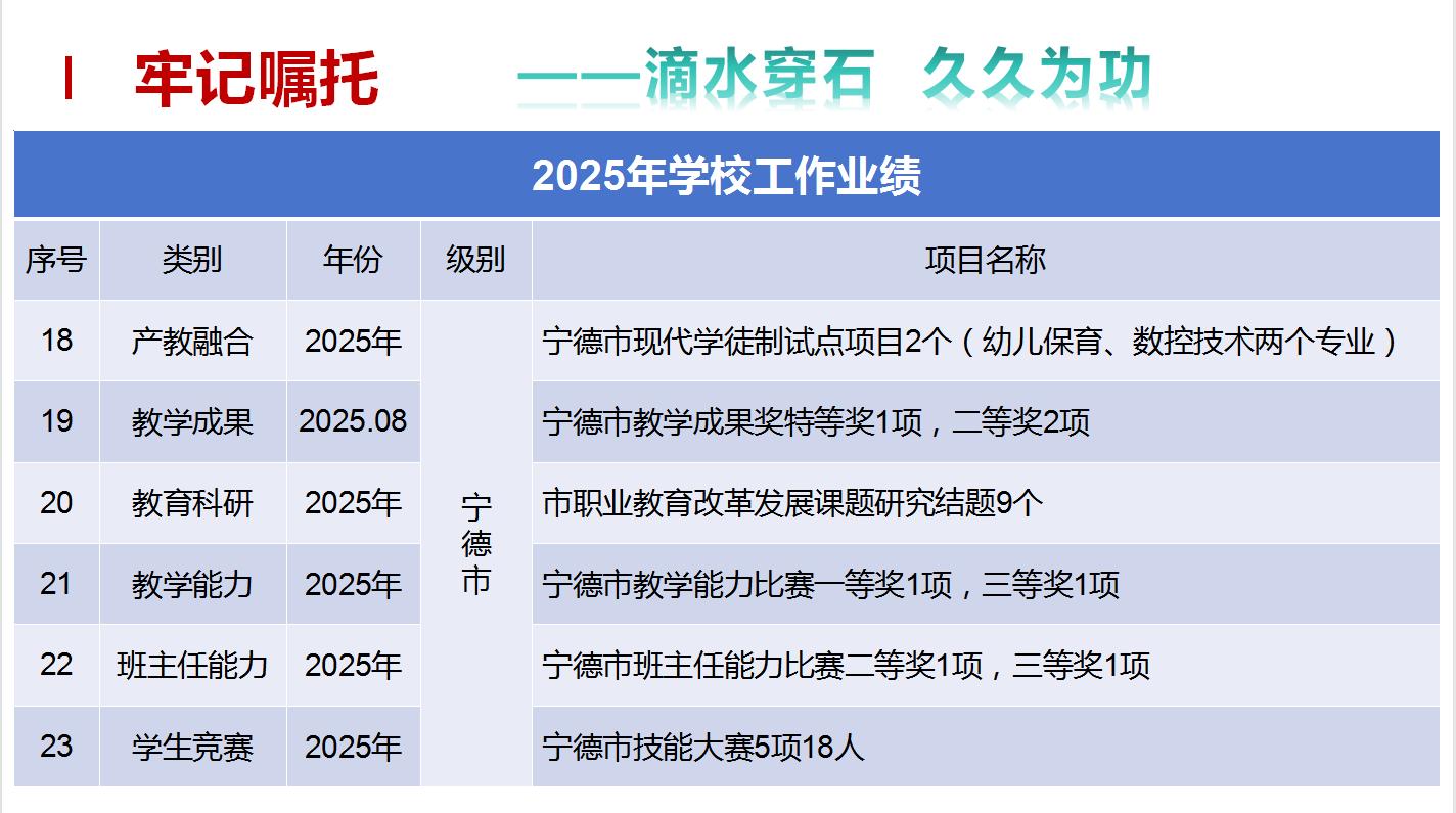 在肯定成绩的同时,曾校长也清醒地指出当前学校发展存在的不足:部分专业校企合作深度有待加强,实训设备更新速度需进一步加快;少数师生安全意识和信息化素养仍需提升;德育活动精品化程度需持续优化。针对这些问题,她明确了新学年三大重点任务:一是深化产教融合,拓展与宁德长盈新能源、亚龙智能装备集团等企业的合作广度,共建更多产业适配的实训基地与特色班级;二是强化师资建设,优化 “双师型” 教师培养机制,搭建教研与竞赛平台,力争 “双师型” 教师占比突破 75%;三是完善德育体系,打造 “五育融合” 精品活动,让学生在实践中提升综合素养,为社会培养更多高素质技术技能人才。