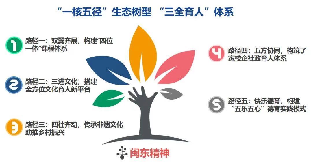 学校以新时代闽东精神为核心,创新设计了“生态树”文化育人成长模型,成功构建了具有鲜明地方特色的中职“三全育人”实践体系,并顺利通过了福建省“三全育人”典型培育校项目的验收。育人模式《闽东精神·非遗传承·双国大师:新时代“三全育人”在地化创新实践》经总结提炼荣获宁德市教学成果一等奖。同时,学校还积极探索并打造了“五乐五心”快乐德育实践新模式,强化家校合作,共同致力于培养学生的道德品质和社会责任感。