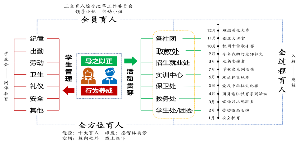 学校秉承“崇德强能”的办学理念,以创建“三全育人”典型培育学校为契机,积极培育践行社会主义核心价值观,落实立德树人根本任务,开创“三全育人”新局面。