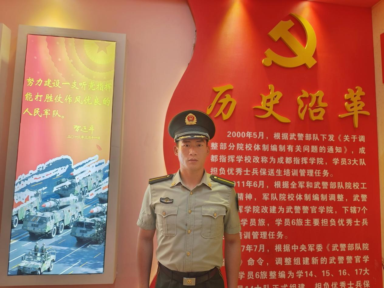 陈杰,2015年毕业于计算机网络专业,曾获“优秀义务兵”、“优秀学员”、“优秀教练员”、“极限训练勇士”、“优秀共产党员”、两次“四有”先进个人、三次“优秀骨干”、两次嘉奖、两次三等功等荣誉。现就读于中国人民武装警察学院武警警官学院。