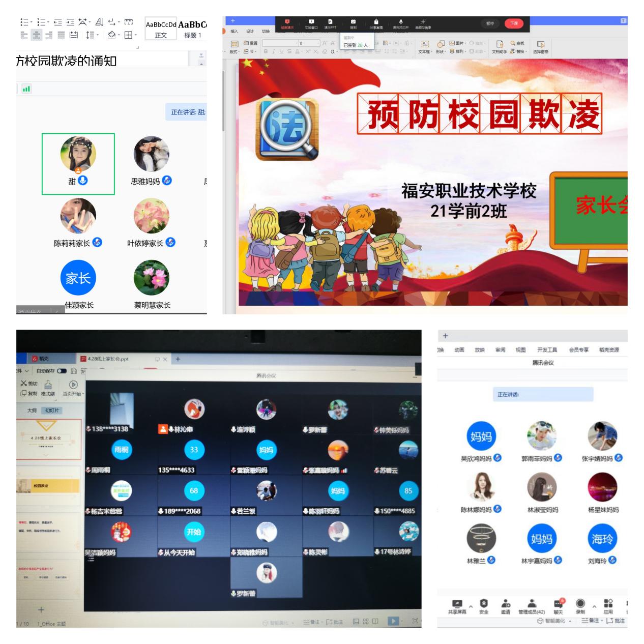 为形成预防校园欺凌家校齐抓共管的良好局面,我校组织各班召开了线上专题家长会,重点与家长交流了校园欺凌的主要形式、校园暴力产生的主要原因、容易受欺凌学生的特征及预防校园暴力的方法,并与家长们共同学习了《家庭教育促进法》相关内容,提高家长安全意识、法治意识,引导家长合法、有效地对学生的思想和行为进行教育。
