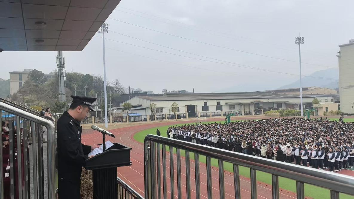 2月17日,学校邀请坂中派出所副所长周律在开学典礼中作安全教育宣讲,从防诈骗、防欺凌、交通安全等领域以案说法,强化学生法治观念。