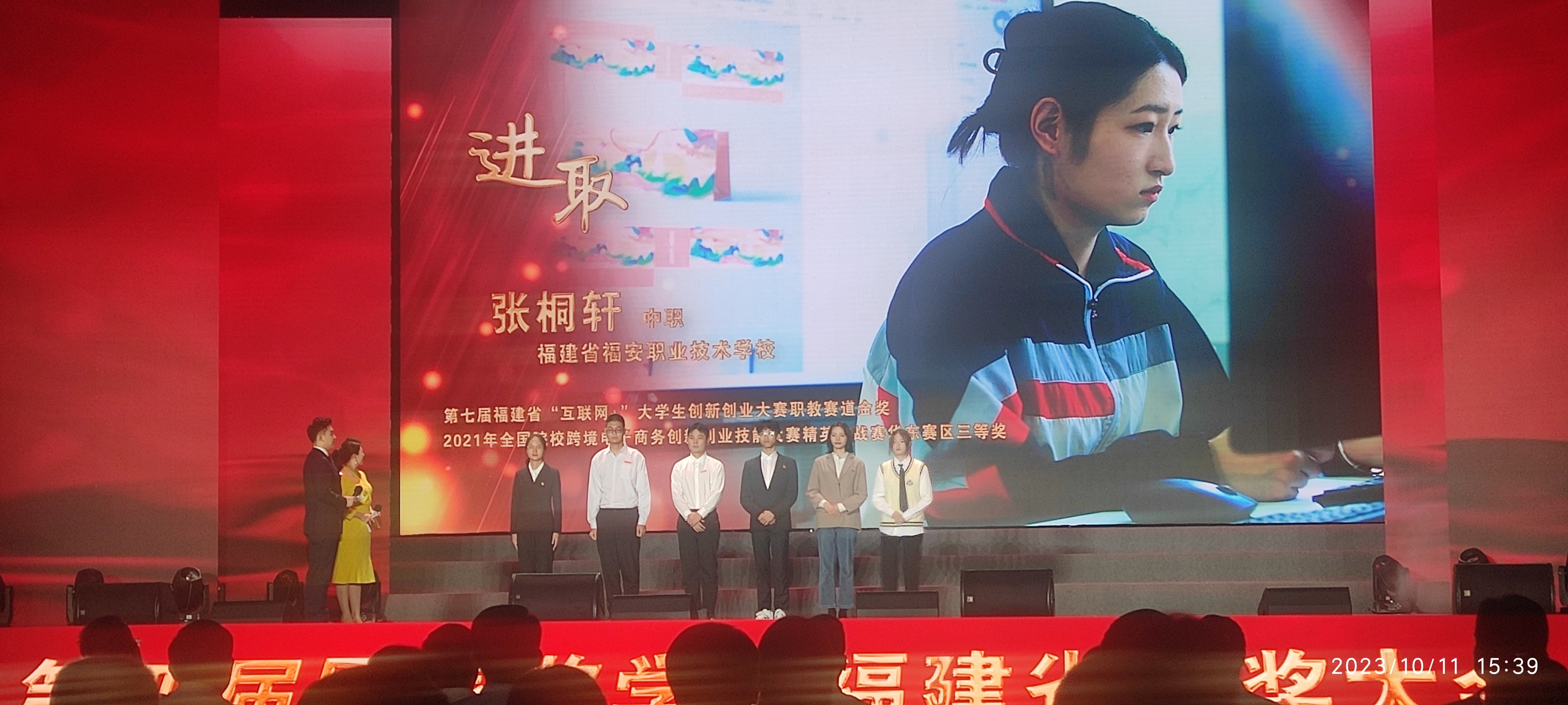 我校2020级电子商务专业学生张桐轩荣获2021-2022学年度中职国家奖学金。2023年10月11日,张桐轩同学作为宁德市中职校唯一获奖代表,受邀参加在闽江学院举办的福建省颁奖大会,充分展现了我校学子自强自立、奋发进取的青春风采。副校长林国梁、校资助中心陈文滔出席颁奖大会。