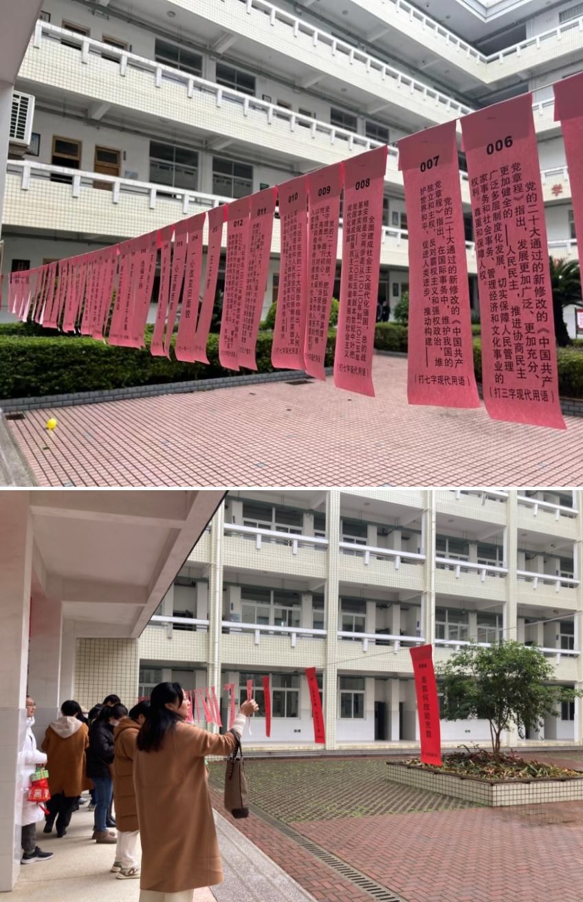 活动项目猜灯谜,从历史中传承下来的经典节目,在老师的心里仍有着不可阻挡的魅力,教学楼走廊挂满了谜语,内容涵盖党史知识、党风廉政文化、法律知识等方面,老师们认真阅读谜面,感受着中国文化的博大精深。