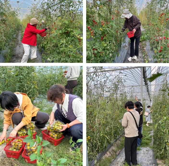 当日下午,女教职工们齐聚学校西大门,自驾前往目的地。一路上,大家满怀期待奔赴田园,抵达弘丰果蔬合作社后,连片的果蔬大棚映入眼帘,红彤彤的西红柿、晶莹剔透的圣女果挂满枝头,生机盎然。卸下教案与粉笔的辛劳,老师们化身田园“采撷者”,穿梭于藤蔓之间,亲手摘下饱满的果实,体验农耕收获的喜悦。欢声笑语在大棚里回荡,清新的果香与春日的暖意交织,身心得到了极大的放松。