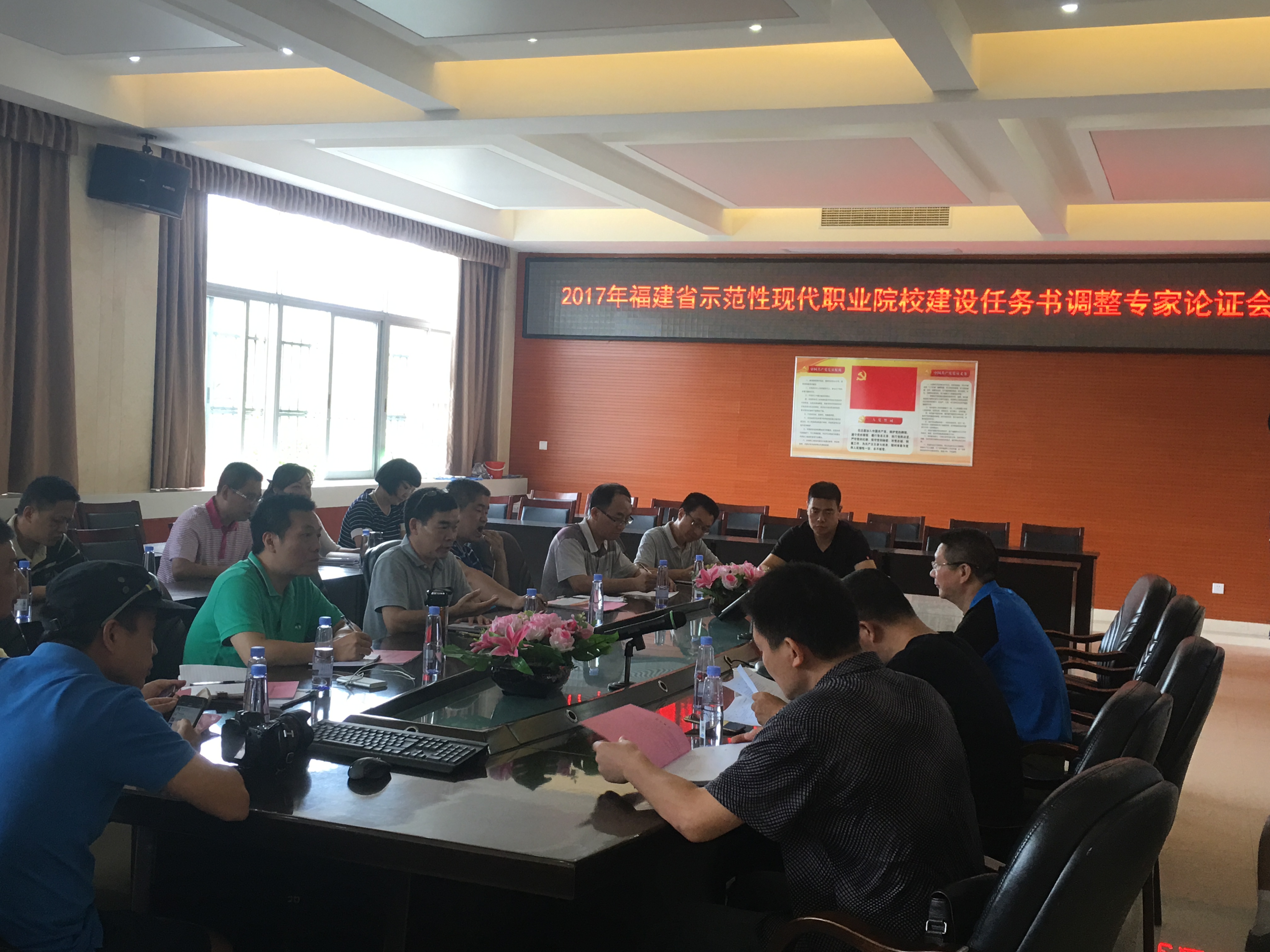 2017年7月8日上午,我校诚挚邀请宁德职业技术学院副院长颜宁禄老师、机械系主任余深松老师和电气系主任燕锦杰老师一行三人莅临我校,三位专家对我校2017年度省示范性现代职业院校项目建设任务书调整进行可行性论证。
