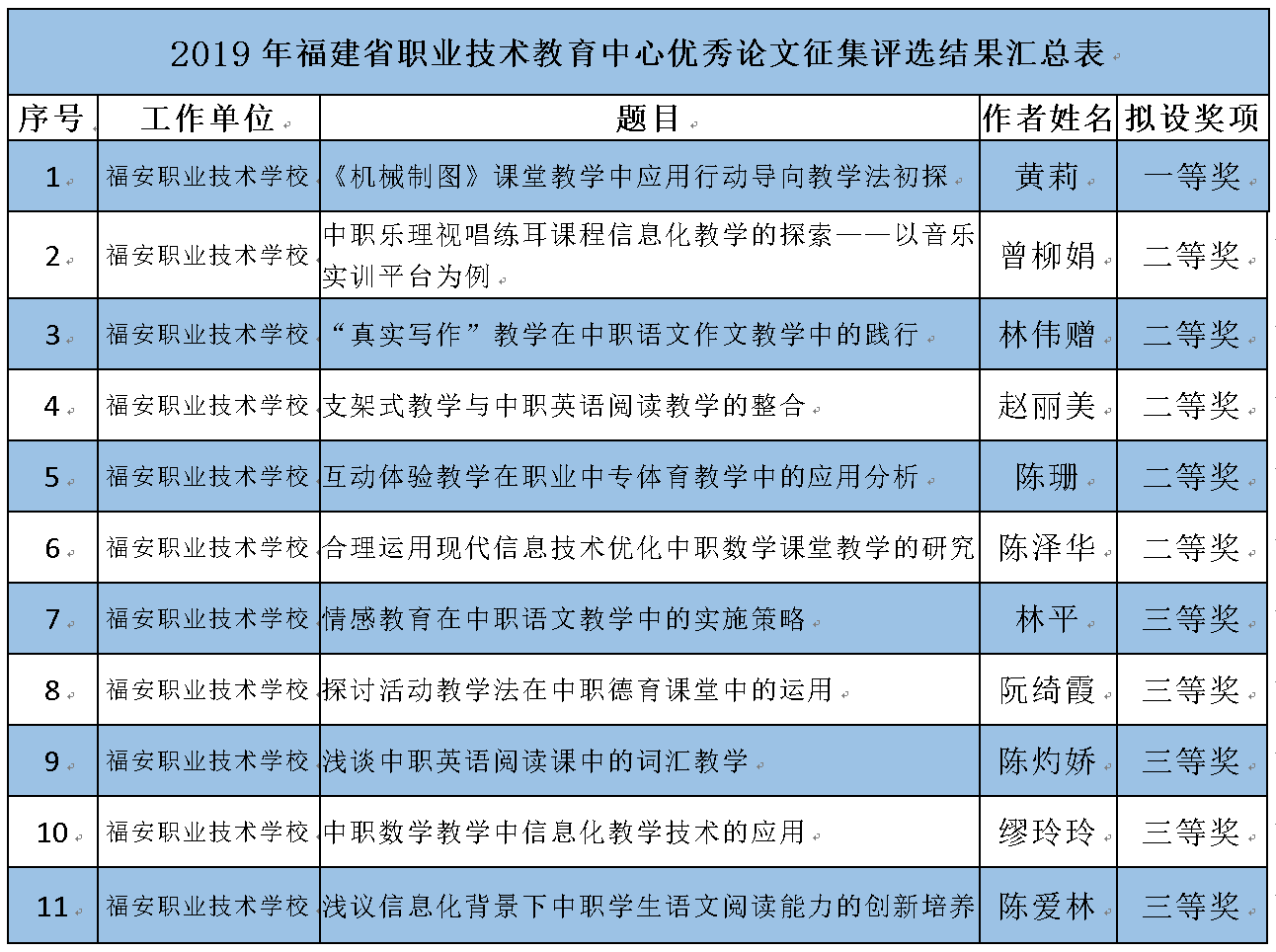 在福建省职业技术教育中心举办的2019年福建省职业教育优秀论文征集评选活动中,经各有关单位推荐,福建职业教育中心组织专家评审,共产生2019年度福建省职业教育优秀论文599篇,其中,福安职业技术学校黄莉、曾柳娟等11位参赛教师凭借扎实的理论功底突破重围,取得了优异的成绩,共获一等奖1项,二等奖5项,三等奖5项,具体名单见附表。