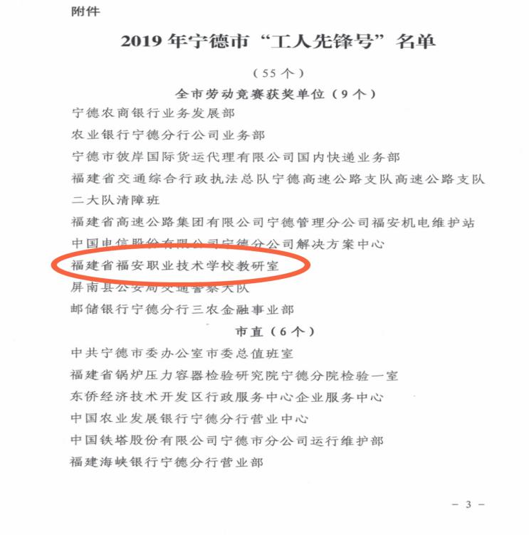 热烈祝贺福安职业技术学校教研室荣获宁德市“工人先锋号”荣誉称号