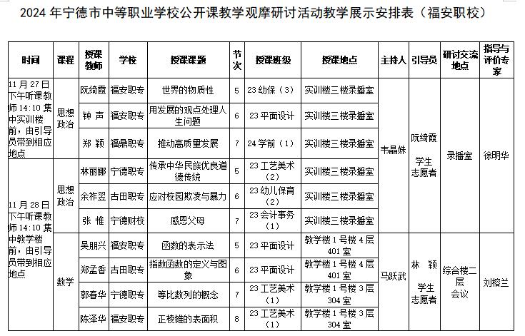 为进一步加强学校内涵建设,推进“三全育人”工作,切实提升教师课程思政建设的意识和能力,为广大教师提供学习交流平台,宁德市职成教研室于11月至12月上旬组织开展了2024年宁德市中等职业学校公开课教学观摩研讨活动,本次活动以“课程思政”为主题,贯彻落实立德树人根本任务,深入挖掘课程德育内涵,推动教师承担起“课程思政”主体责任,做好课程育人教学设计、创新教育教学方式方法,充分发挥课程的育人功能,将思想政治工作贯穿教育教学全过程,进一步发挥课堂教学的育人主渠道作用,培养适应产业需求的技术技能型人才。2024年11月27日-11月29日,福安职业技术学校承办了思想政治、数学和机电技术应用、会计事务和茶艺与茶营销等专业课程的公开课教学观摩研讨活动,内容主要包括专家讲座、教学展示和交流研讨。