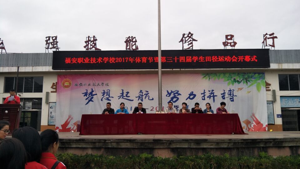 2017年11月15日—17日,福安职业技术学校举行了为时三天的体育节暨第34届运动会。15日早上8点,福安职业技术学校全体师生在奏起昂扬的乐曲声中,迈着矫健的步伐进入运动场。随着五星红旗的冉冉升起,第34届校运动会正式拉开了序幕。政教处林建书主任主持开幕式,我校领导班子成员及各处室负责人出席了开幕式。首先,我校陈强副校长在开幕式上发表了热情洋溢的讲话,希望全体运动员以饱满的激情,顽强的信念,团队协作的精神投入到本次运动会中,赛出成绩,赛出水平!其次,运动员代表和裁判员代表分别宣誓。接着,陈强副校长宣布福安职校2017-2018学年体育节暨第34届运动会开幕。最后,意气风发、精神抖擞的运动员们迈着整齐化一的步伐,喊着嘹亮的口号进行了入场式。