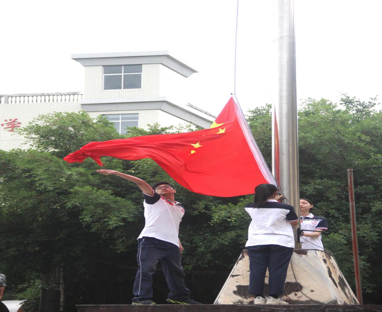 其次,举行了升旗仪式。国旗在庄严的国歌声中冉冉升起,五星红旗迎风飘扬。