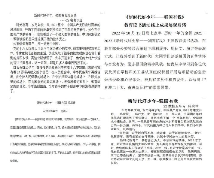 为营造校园“人人践行核心价值观、争当时代新人”的氛围,培育践行学生社会主义核心价值观教育,我校组织学生观看《新时代好少年—强国有我》主题教育读书活动线上成果展直播,并让学生写观后感,展现了新时代广大同学们歌颂中国共产党、热爱伟大祖国的真挚情怀和请党放心、强国有我的铮铮誓言以及奋发有为、立志报国的精神风貌。