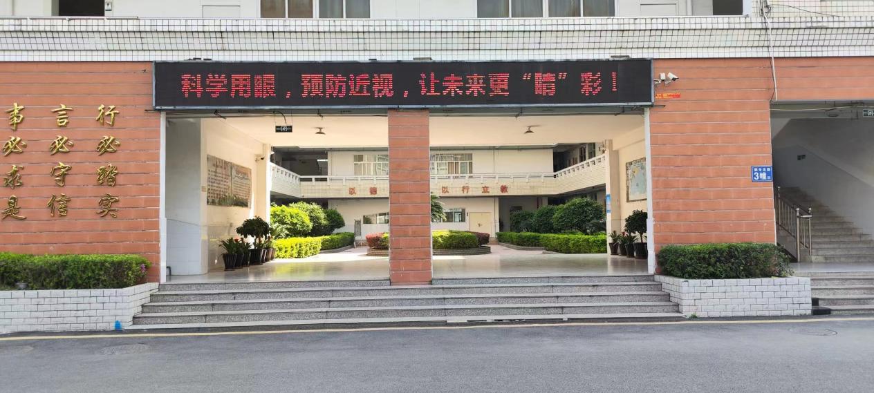 校园教学楼大厅LED屏幕滚动播放科学防控近视的宣传标语:“爱护双眼,远离近视,清晰世界从今天开始!”“科学用眼,预防近视,让未来更‘睛’彩!”等。