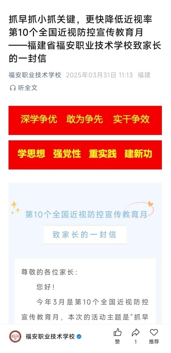 为构建家校协同的近视防控体系,我校通过官方微信公众号发布了《抓早抓小抓关键,更快降低近视率 第10个全国近视防控宣传教育月 ——福建省福安职业技术学校致家长的一封信》。这封满载关爱的公开信详细阐述了近视防控的重要性,提供了居家护眼的实用建议,并呼吁家长与学校携手,共同关注孩子的用眼健康,为孩子们构筑一道坚实的视力保护屏障。通过新媒体平台的广泛传播,让科学的护眼理念深入每个家庭。