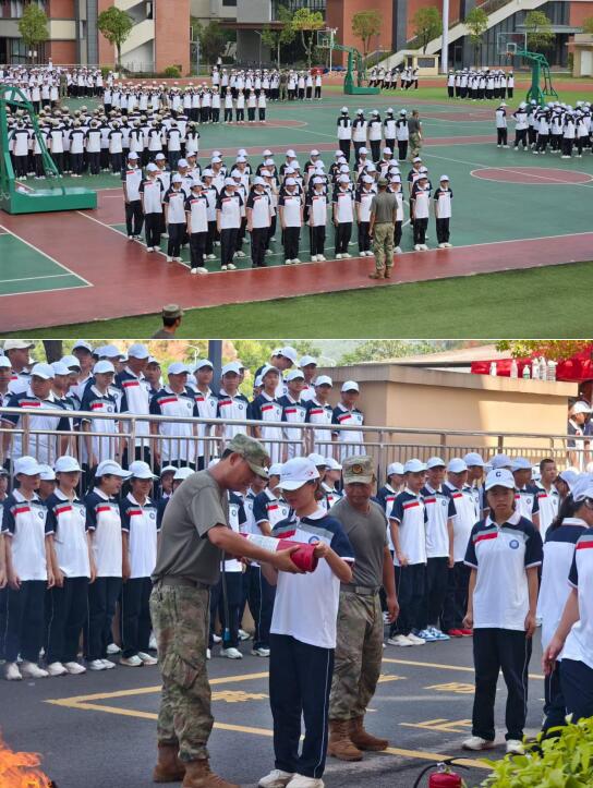 国旗护卫队迈着铿锵步伐护送国旗入场,全体师生肃立注目。谢方军副校长在致辞中强调军训对新生“立德树人”的重要意义,林国锋总教官则以“流血流汗不流泪,掉皮掉肉不掉队”的誓言激励学子勇毅前行。