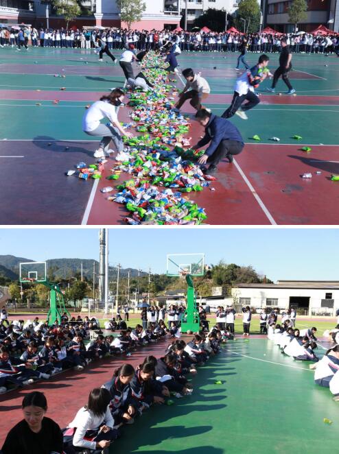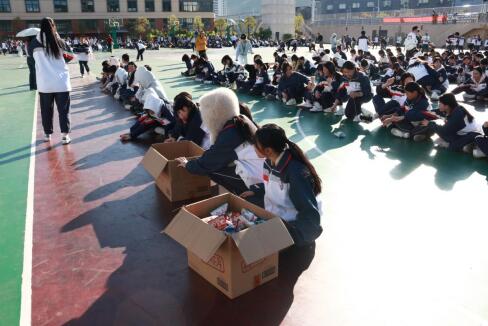 运动会的最后一个项目“零食大作战”为这场运动会增添了别样的欢乐与趣味。每个班级派出师生代表队,班主任与科任老师交替前往零食区抢运食品,本班20名学生席地而坐,以接力的方式把零食运至终点零食箱。平日站在讲台上的老师们换上运动装,一改严肃形象,与学生们共同完成挑战,默契配合展现别样风采,欢声笑语响彻操场。