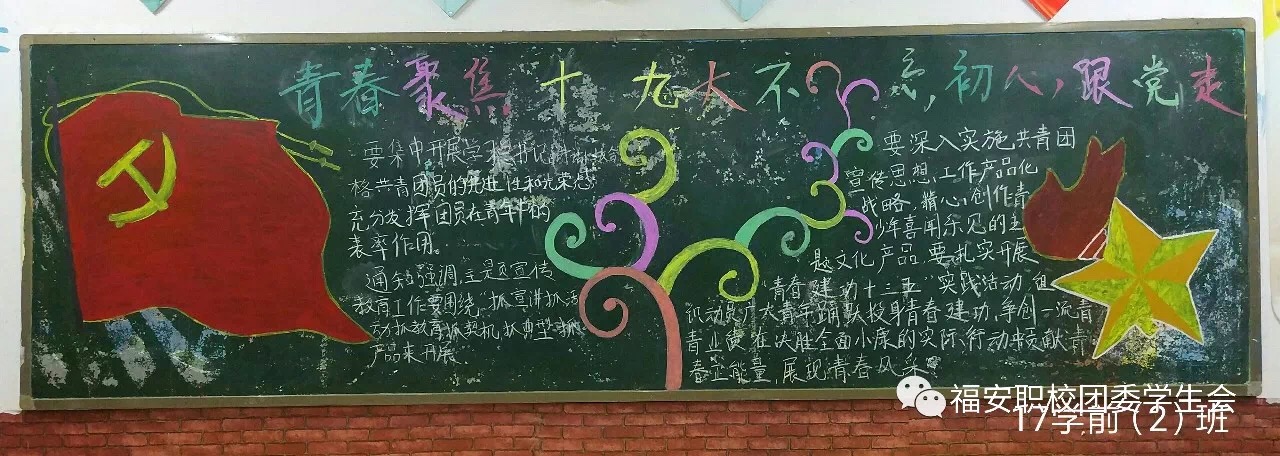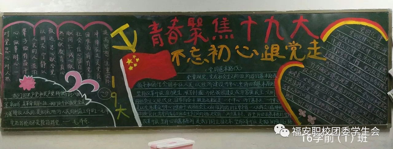 为加强爱国主义教育,美化班级文化环境福安职业技术学校开展了以“青春聚焦十九大,不忘初心跟党走”为主题的班级黑板报评比活动。以下是本次板报评比的前5名评选照片及各班成绩: