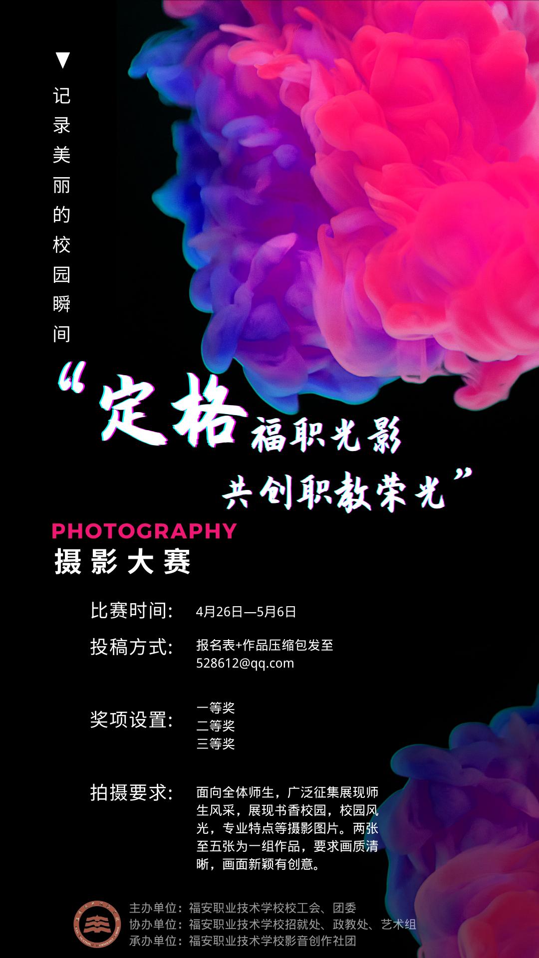 为了更好地宣传职业教育并推动我校文明校园建设,丰富师生课余活动,提升校园艺术品位,为广大摄影爱好者提供展现自我价值的平台,促进摄影爱好者的交流,全面展示新时代师生风采,福安职业技术学校特举办此次摄影大赛。希望全校师生积极参与,秀出你的技艺,亮出你的图片。本次摄影大赛分教师组和学生组。
