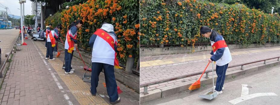 志愿者们手持清洁工具,不怕脏、不怕累,认真清扫垃圾,捡拾杂物,分工合作,配合默契。认真清扫路面垃圾,仔细清理草丛中的烟头、纸屑,让道路重现整洁。用行动诠释当代雷锋精神,为营造干净整洁、文明和谐的校园环境贡献了自己的力量。