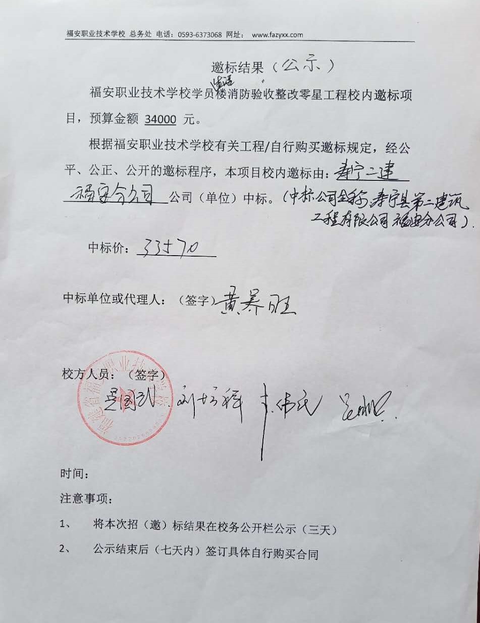 福安职业技术学校学员楼消防验收整改零星工程邀标结果公示