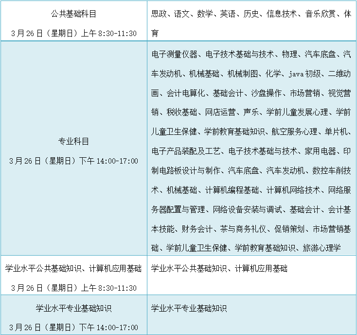 我校往届生也可以参加以下科目的补考,3月23日和24日到学校教务处报名,登记姓名、原就读班级、补考科目和联系电话,并取得考试账号。