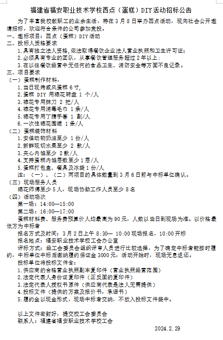 福安职业技术学校西点(蛋糕)D I Y活动招标公告