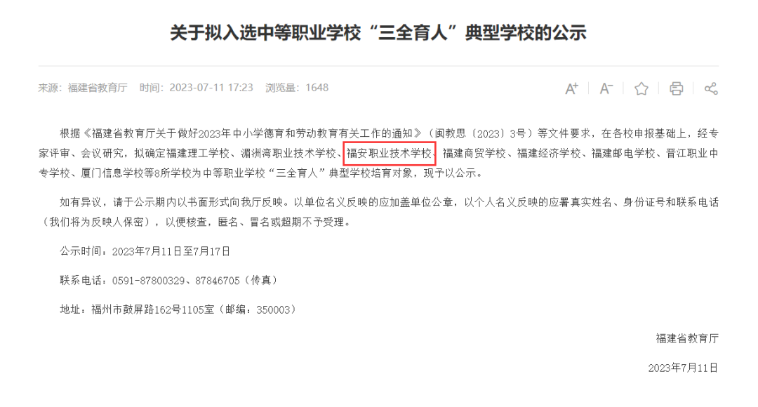 近日,经专家评审、研究和公示,福建省教育厅确定我校为福建省中等职业学校“三全育人”典型学校培育对象。